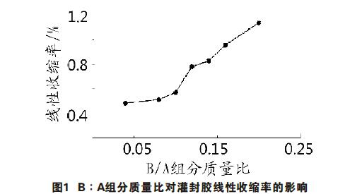 2結(jié)果與討論 2.1線性收縮率 考查A、B組分質(zhì)量比對灌封膠線性收縮率的影響,結(jié)果見圖1。