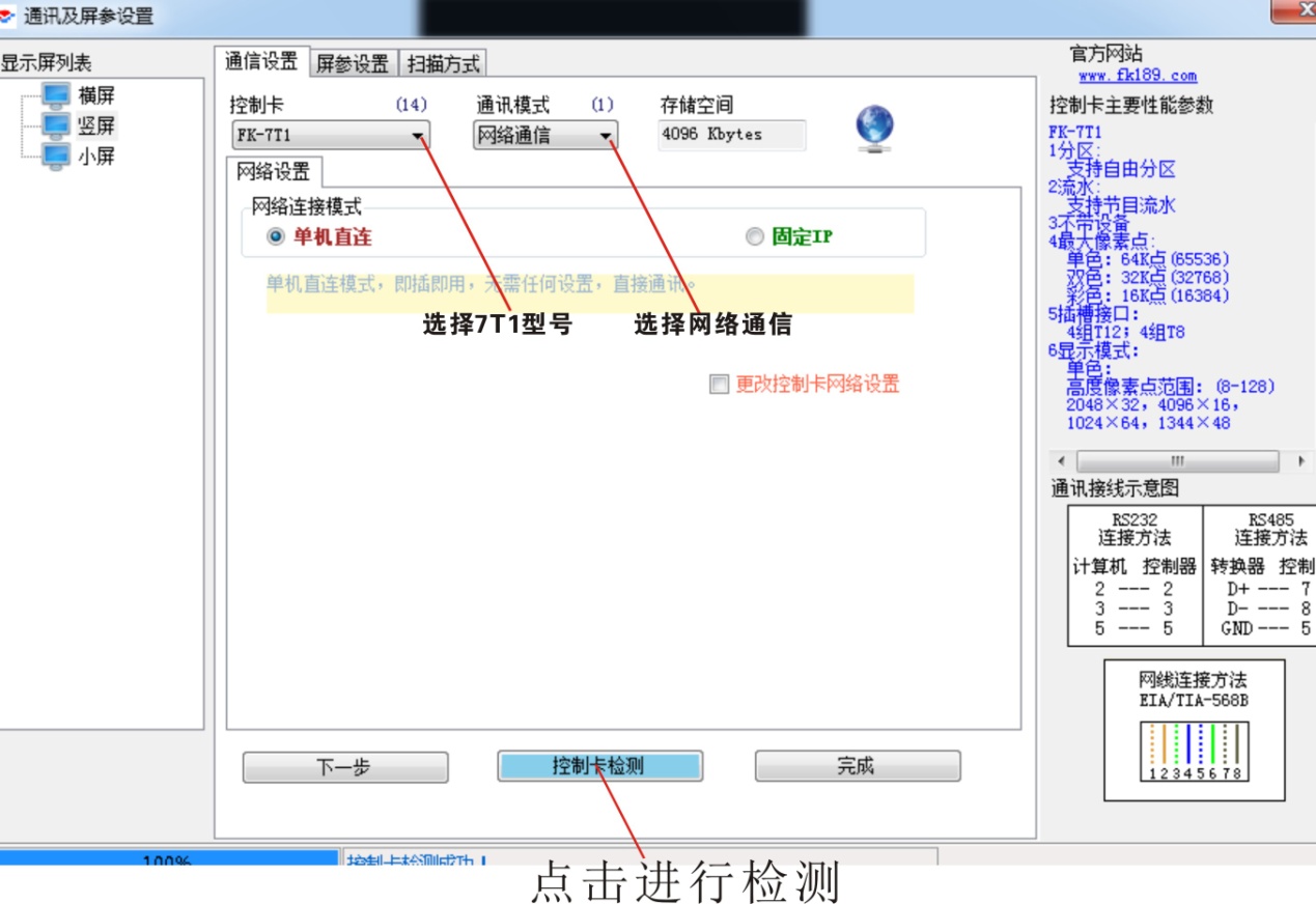 (1)通訊設備,控制卡選擇本屏的FK-7T1,通訊模式選擇網口,再點下面控制卡檢測。