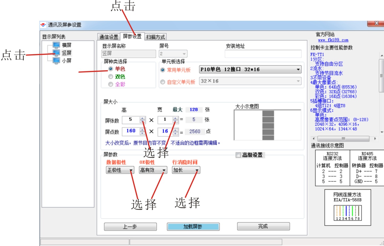 (2)點較上面屏參設置,根據本屏選擇單色,豎屏,將屏寬、屏高通過小箭頭調成5和1,數據很性:正,OE很性:正,消隱時間:加長,然后點加載屏參。成功后點完成。